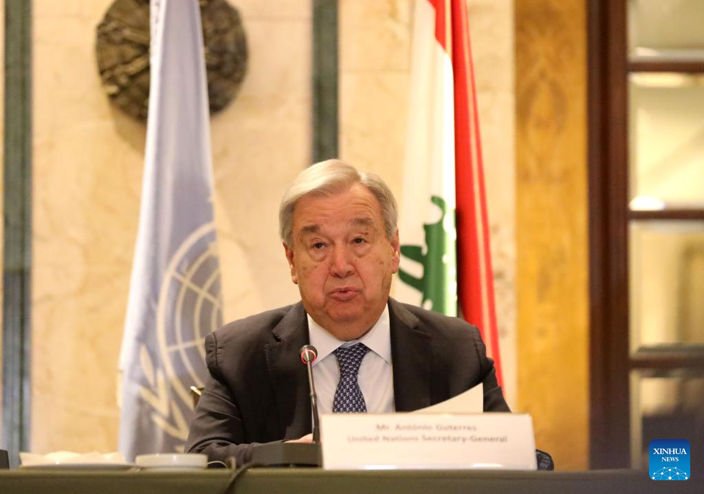 Guterres called for an immediate de-escalation between Israel and Lebanon during a press conference in Beirut on Saturday, warning that escalating violence risks devastating large parts of the country. (Photo by Bilal Jawich/Xinhua)