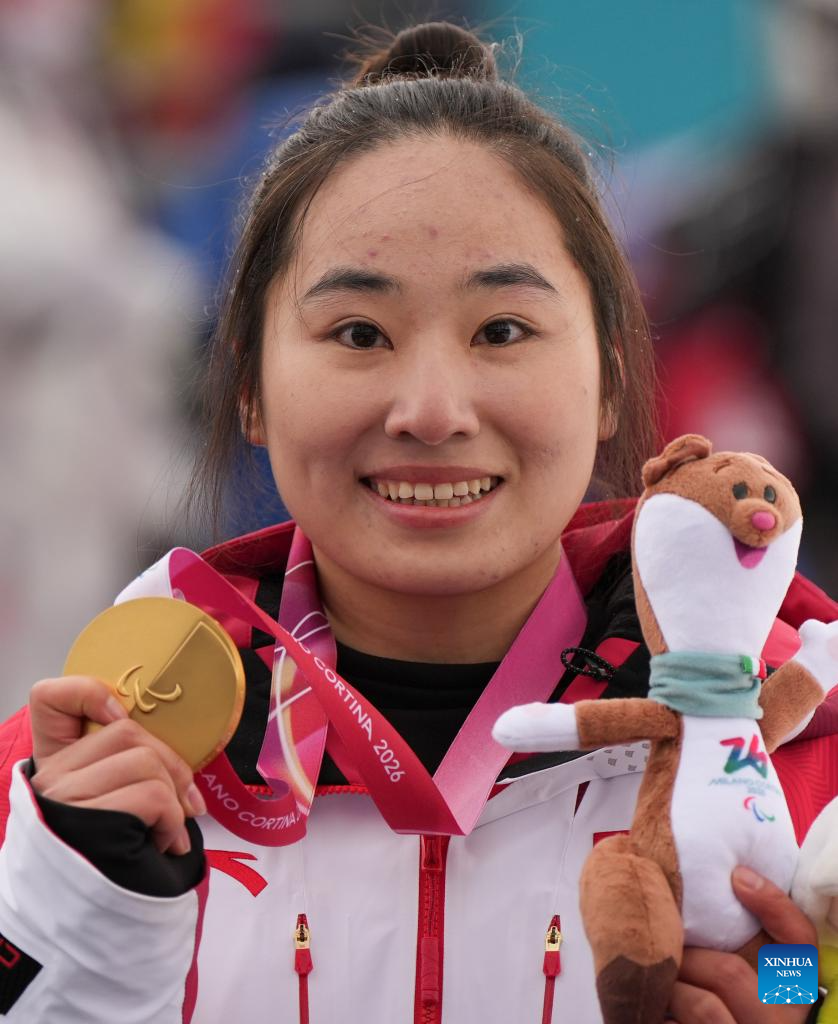 Gold medalist Zhang Wenjing of China reacts after the awarding ceremony for the para alpine skiing women's slalom sitting event at the Milan-Cortina 2026 Paralympic Winter Games in Cortina D'ampezzo, Italy, March 14, 2026. (Xinhua/Wang Kaiyan)