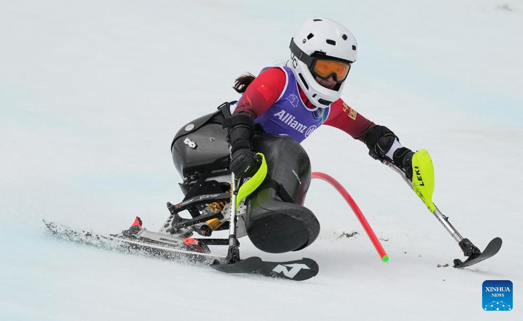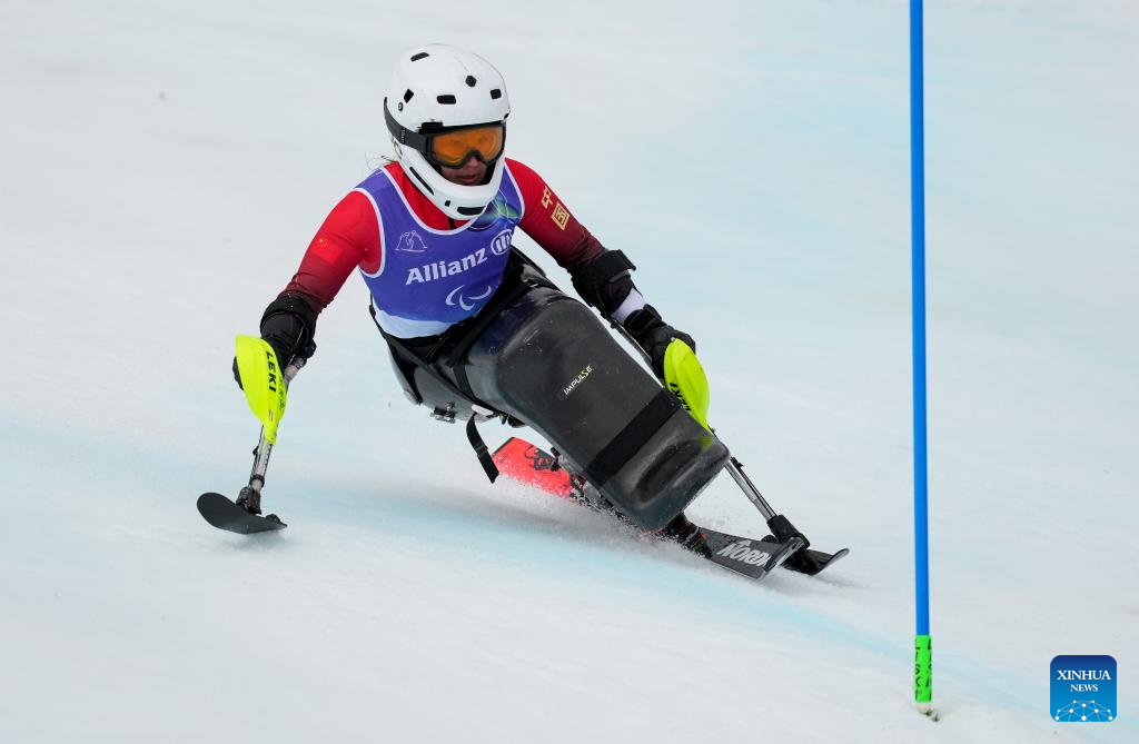 Zhang Wenjing of China competes during the para alpine skiing women's slalom sitting event at the Milan-Cortina 2026 Paralympic Winter Games in Cortina D'ampezzo, Italy, March 14, 2026. (Xinhua/Wang Kaiyan)