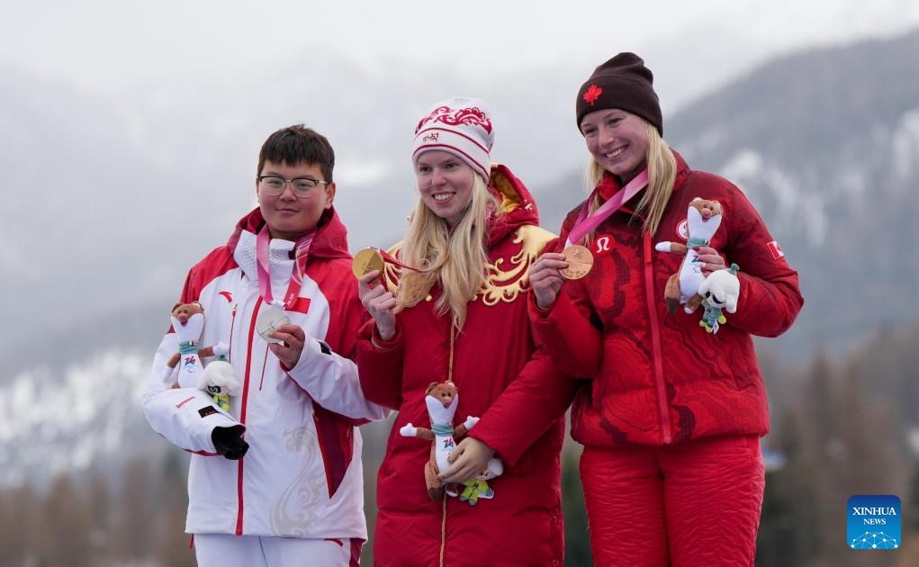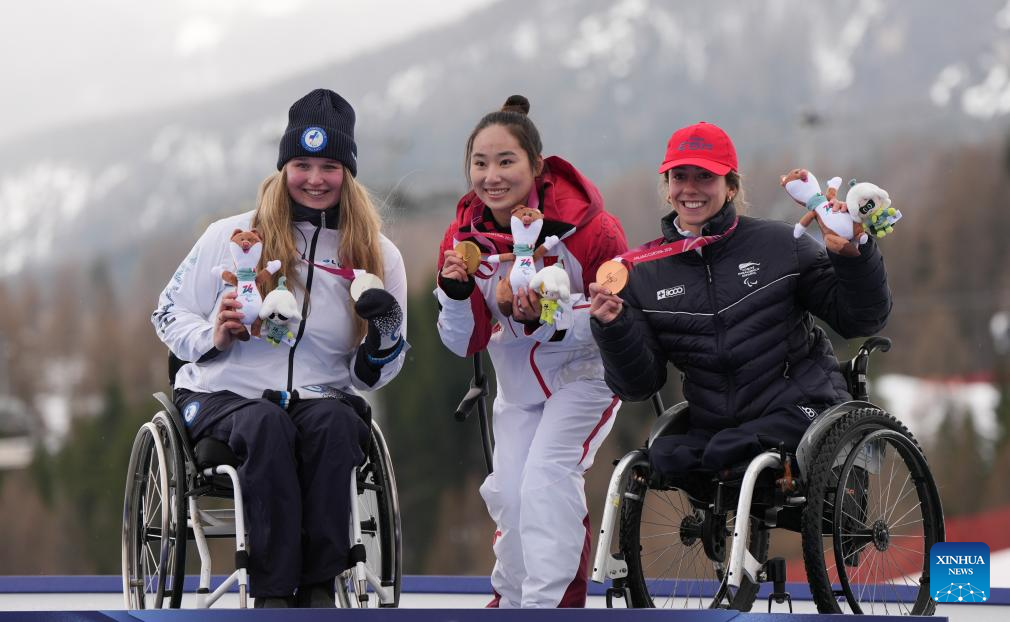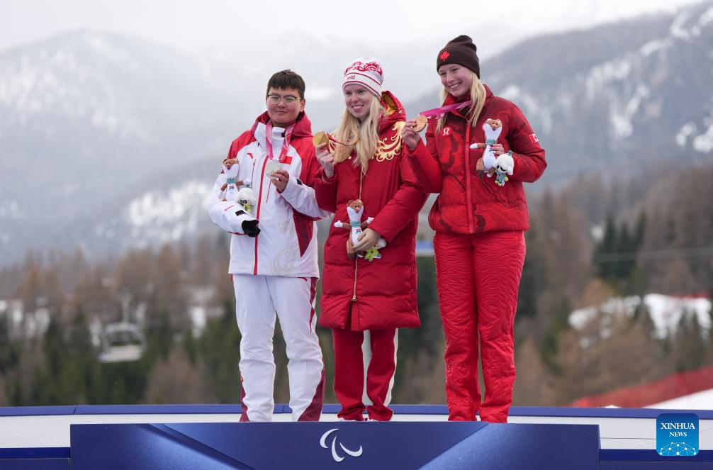 Gold medalist Varvara Voronchikhina (C) of Russia, silver medalist Zhu Wenjing (L) of China and bronze medalist Michaela Gosselin of Canada pose during the awarding ceremony for the para alpine skiing women's slalom standing event at the Milan-Cortina 2026 Paralympic Winter Games in Cortina D'ampezzo, Italy, March 14, 2026. (Xinhua/Wang Kaiyan)