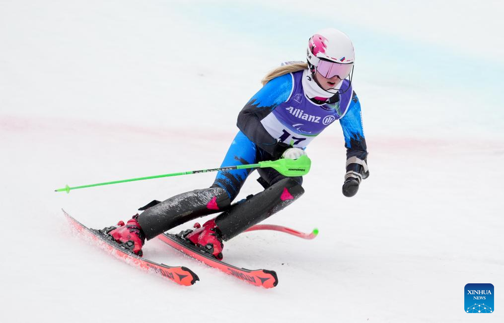 Varvara Voronchikhina of Russia competes during the para alpine skiing women's slalom standing event at the Milan-Cortina 2026 Paralympic Winter Games in Cortina D'ampezzo, Italy, March 14, 2026. (Xinhua/Wang Kaiyan)