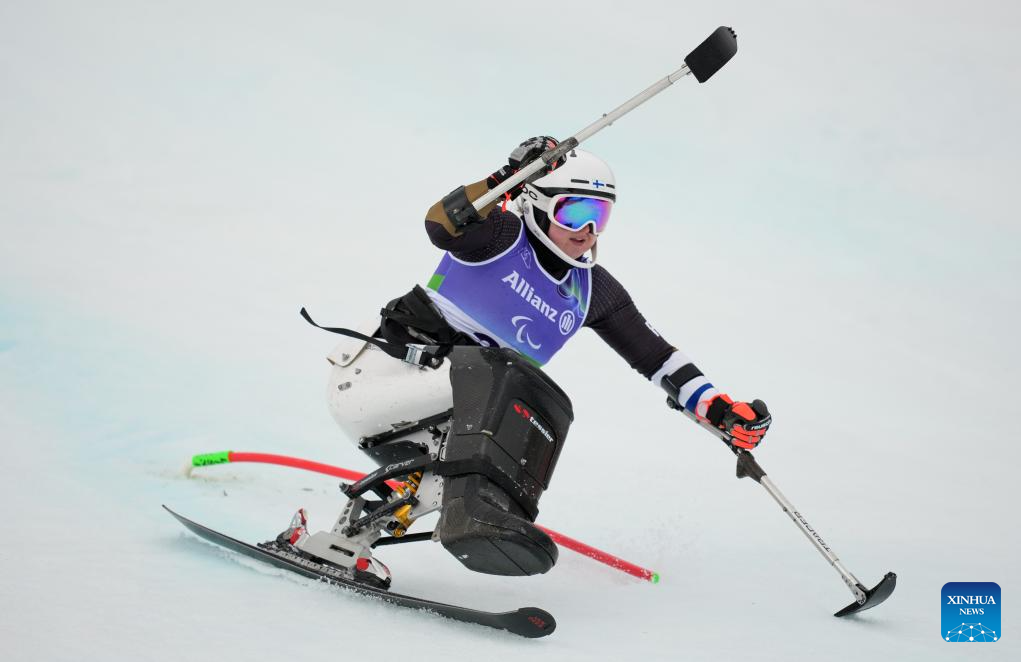 Nette Kiviranta of Finland competes during the para alpine skiing women's slalom sitting event at the Milan-Cortina 2026 Paralympic Winter Games in Cortina D'ampezzo, Italy, March 14, 2026. (Xinhua/Wang Kaiyan)