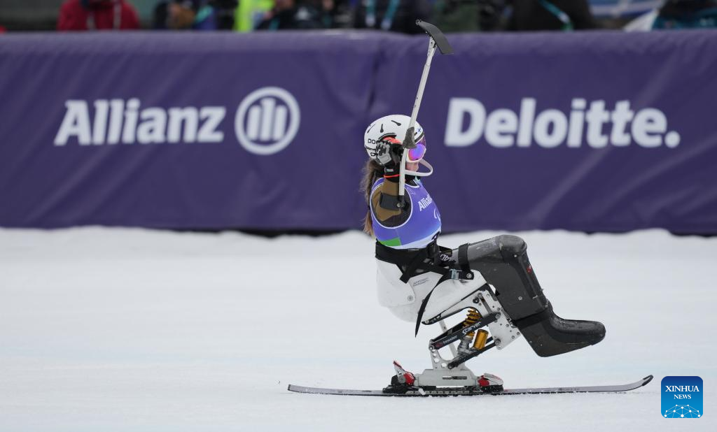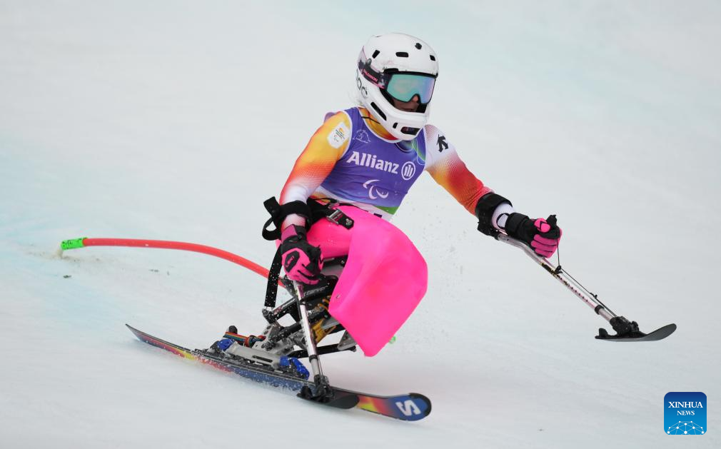 Audrey Pascual Seco of Spain competes during the para alpine skiing women's slalom sitting event at the Milan-Cortina 2026 Paralympic Winter Games in Cortina D'ampezzo, Italy, March 14, 2026. (Xinhua/Wang Kaiyan)