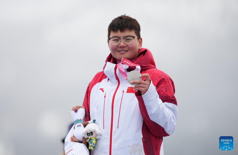 Silver medalist Zhu Wenjing of China poses during the awarding ceremony for the para alpine skiing women's slalom standing event at the Milan-Cortina 2026 Paralympic Winter Games in Cortina D'ampezzo, Italy, March 14, 2026. (Xinhua/Wang Kaiyan)