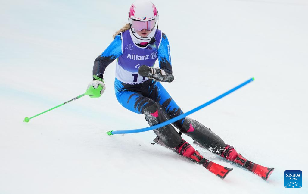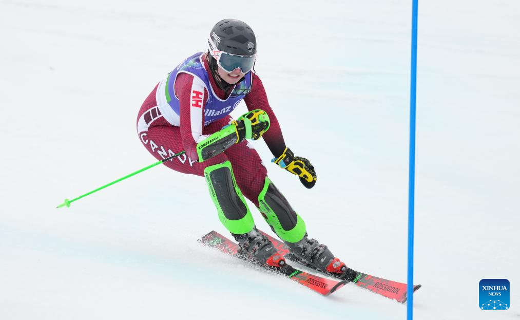 Michaela Gosselin of Canada competes during the para alpine skiing women's slalom standing event at the Milan-Cortina 2026 Paralympic Winter Games in Cortina D'ampezzo, Italy, March 14, 2026. (Xinhua/Wang Kaiyan)