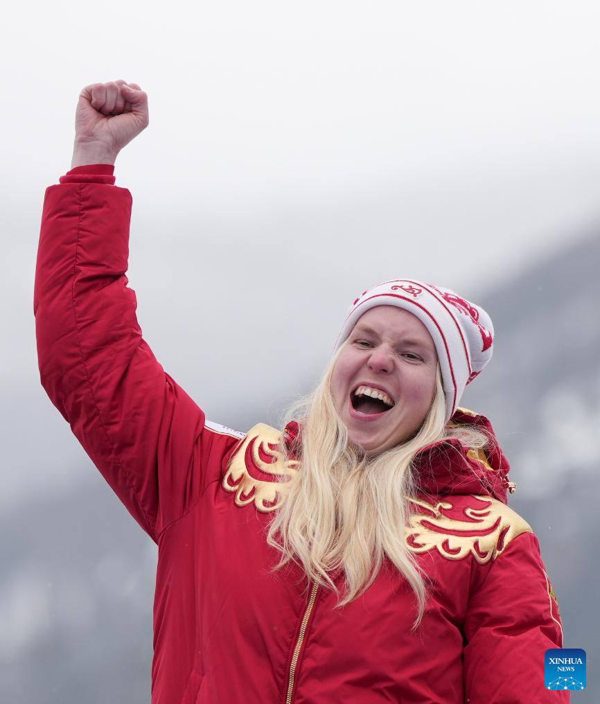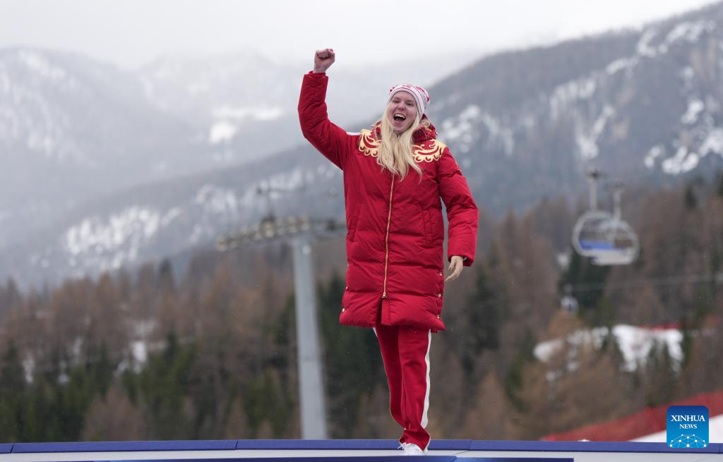 Varvara Voronchikhina of Russia celebrates during the awarding ceremony for the para alpine skiing women's slalom standing event at the Milan-Cortina 2026 Paralympic Winter Games in Cortina D'ampezzo, Italy, March 14, 2026. (Xinhua/Wang Kaiyan)