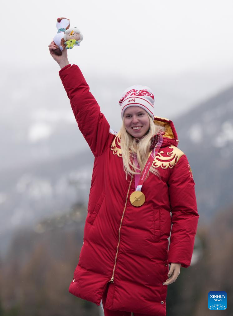 Gold medalist Varvara Voronchikhina of Russia celebrates during the awarding ceremony for the para alpine skiing women's slalom standing event at the Milan-Cortina 2026 Paralympic Winter Games in Cortina D'ampezzo, Italy, March 14, 2026. (Xinhua/Wang Kaiyan)