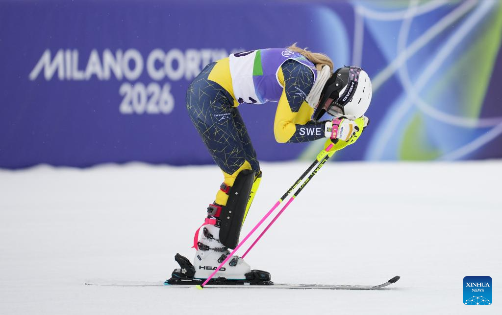 Ebba Aarsjoe of Sweden reacts during the para alpine skiing women's slalom standing event at the Milan-Cortina 2026 Paralympic Winter Games in Cortina D'ampezzo, Italy, March 14, 2026. (Xinhua/Wang Kaiyan)