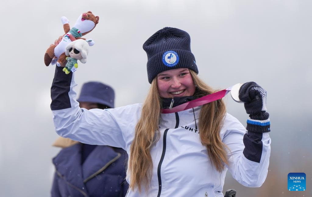Silver medalist Nette Kiviranta of Finland reacts during the awarding ceremony for the para alpine skiing women's slalom sitting event at the Milan-Cortina 2026 Paralympic Winter Games in Cortina D'ampezzo, Italy, March 14, 2026. (Xinhua/Wang Kaiyan)