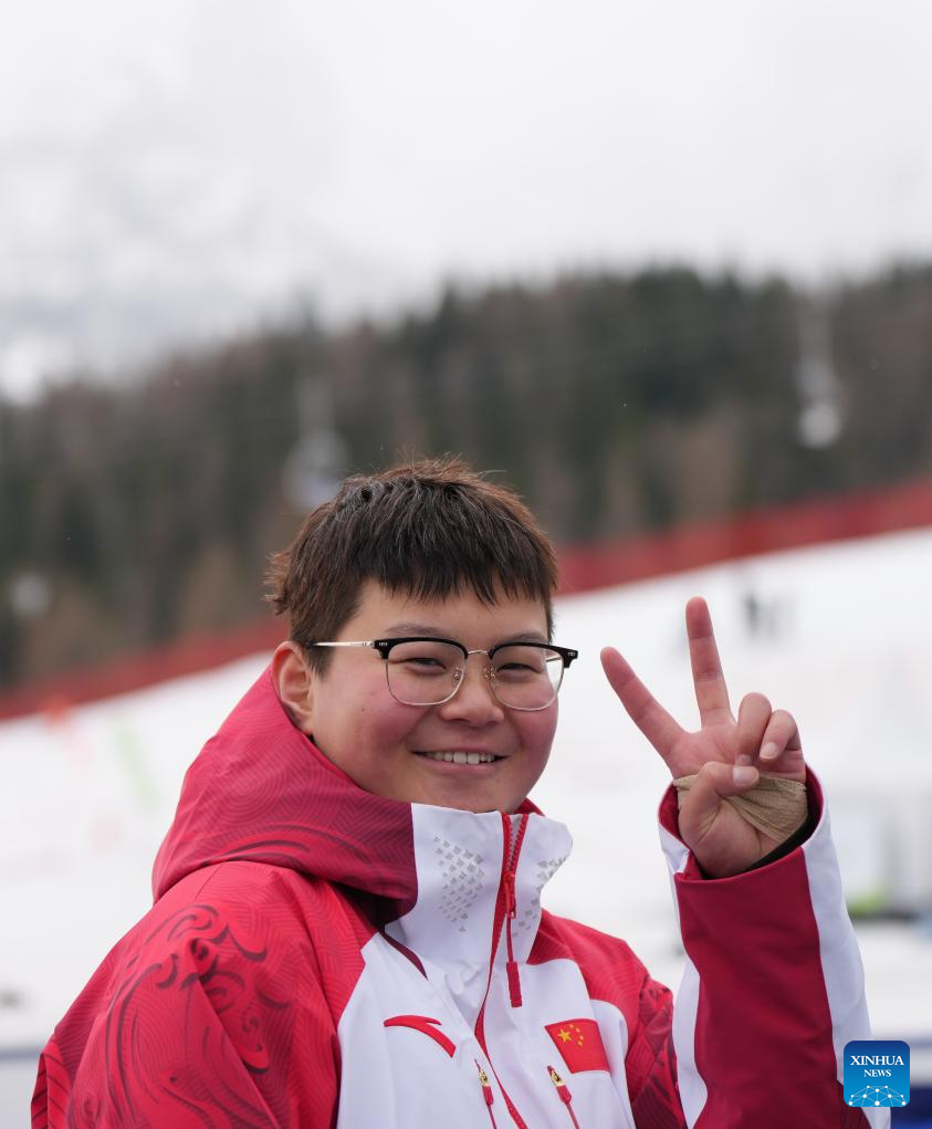 Silver medalist Zhu Wenjing of China poses before the awarding ceremony for the para alpine skiing women's slalom standing event at the Milan-Cortina 2026 Paralympic Winter Games in Cortina D'ampezzo, Italy, March 14, 2026. (Xinhua/Wang Kaiyan)