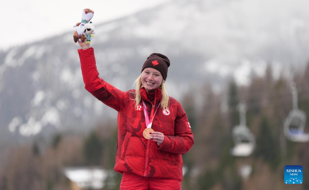 Bronze medalist Michaela Gosselin of Canada reacts during the awarding ceremony for the para alpine skiing women's slalom standing event at the Milan-Cortina 2026 Paralympic Winter Games in Cortina D'ampezzo, Italy, March 14, 2026. (Xinhua/Wang Kaiyan)