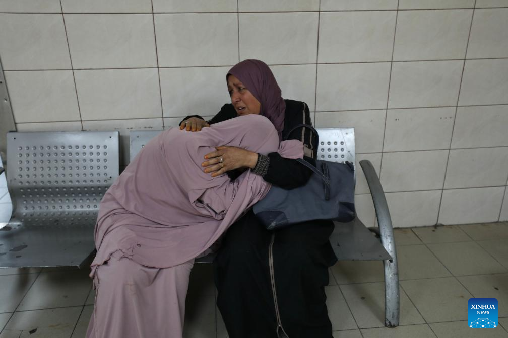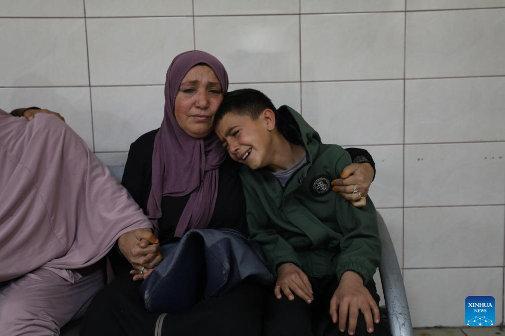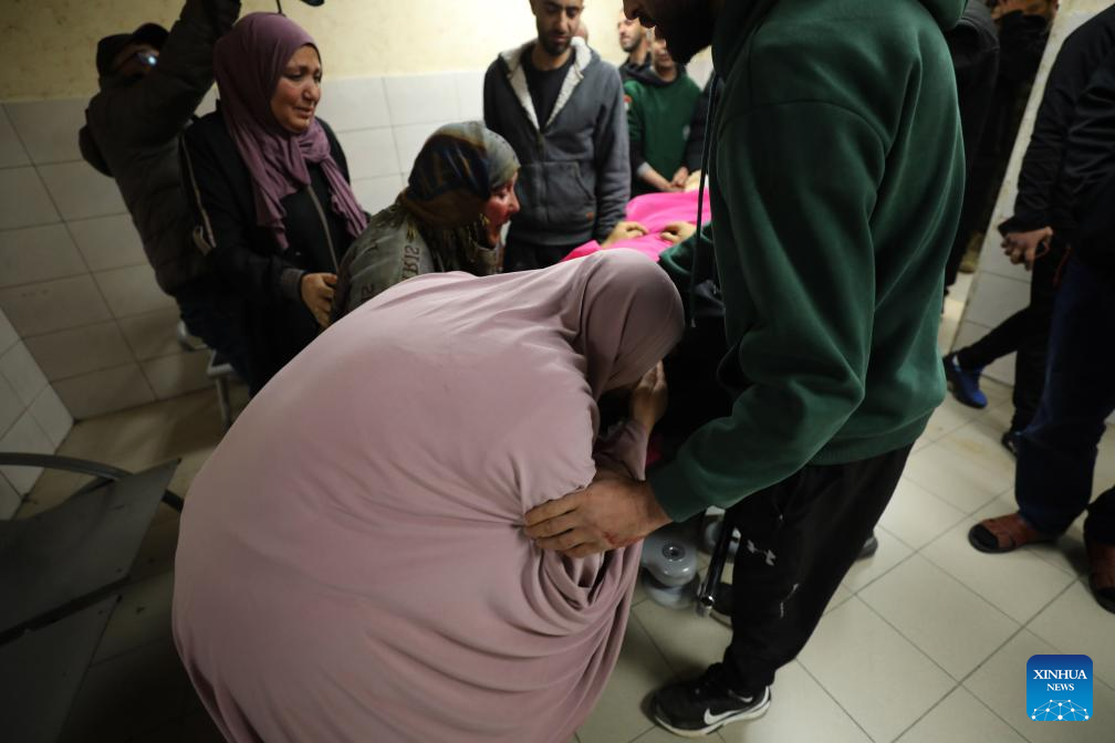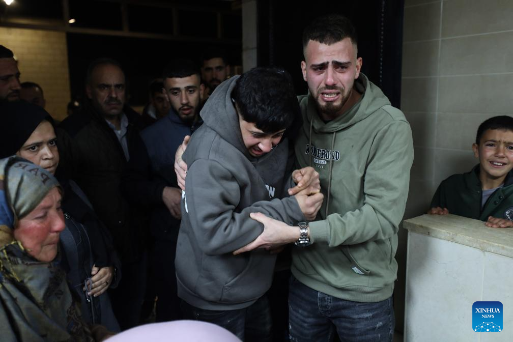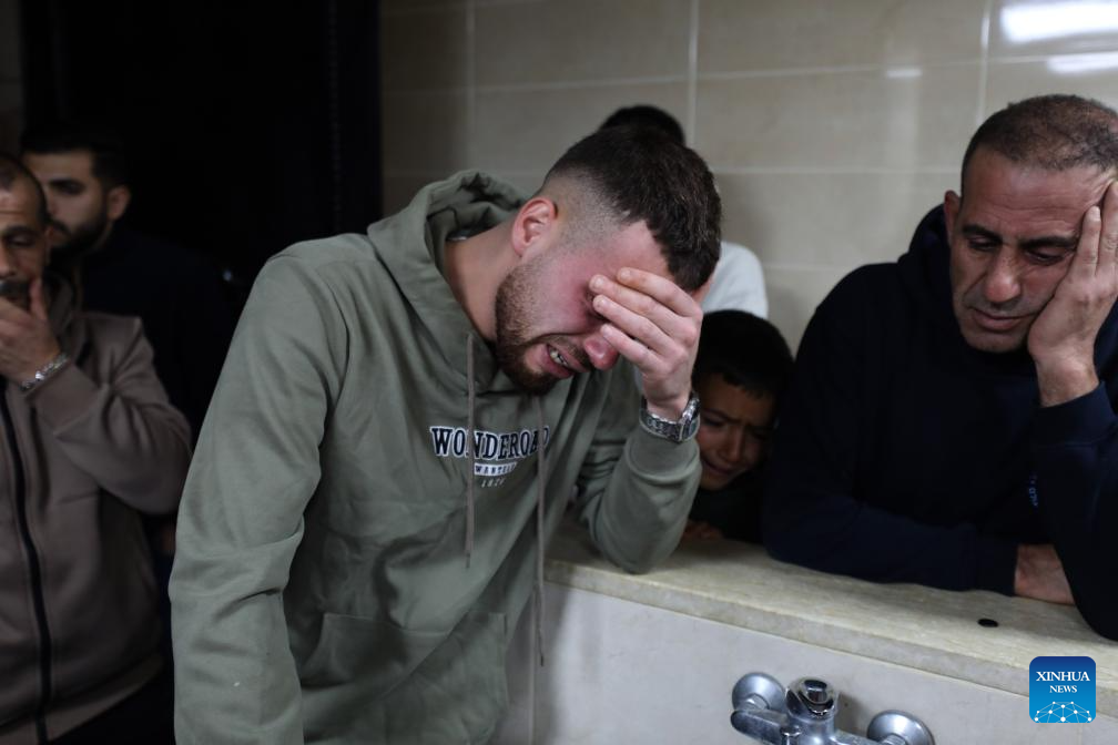 Palestinians mourn for a Palestinian man killed by Israeli settler violence, at a hospital in Nablus, in the northern West Bank, on March 14, 2026. A Palestinian man was killed and three others were injured on Saturday after Israeli settlers opened fire during an attack in the northern West Bank, according to the Palestinian Red Crescent Society and local officials. (Photo by Nidal Eshtayeh/Xinhua)