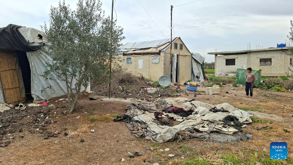 Remains of a burnt tent are seen in the village of Jlein after shrapnel from an intercepted drone fell on the area amid the widening conflict between Iran, Israel, and the United States, in western Daraa, Syria, March 13, 2026. (Str/Xinhua)