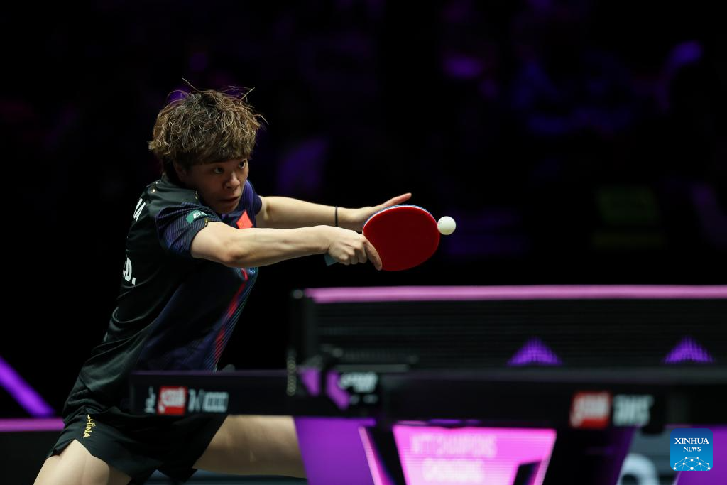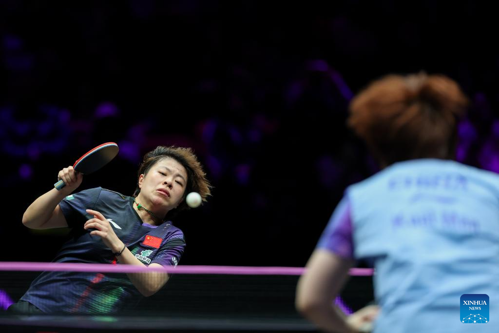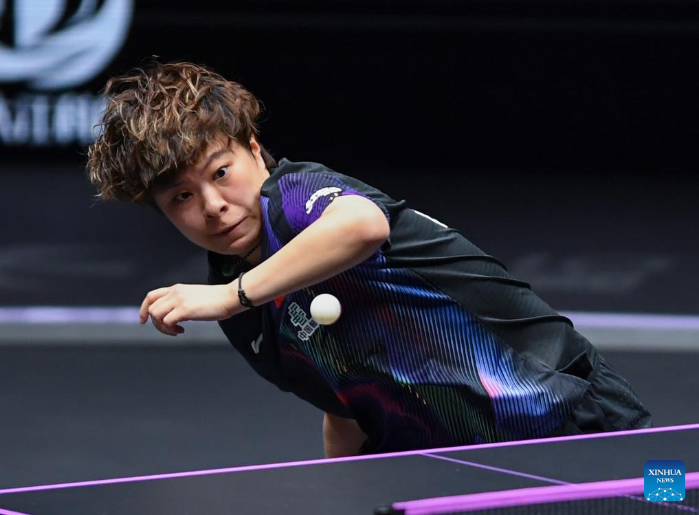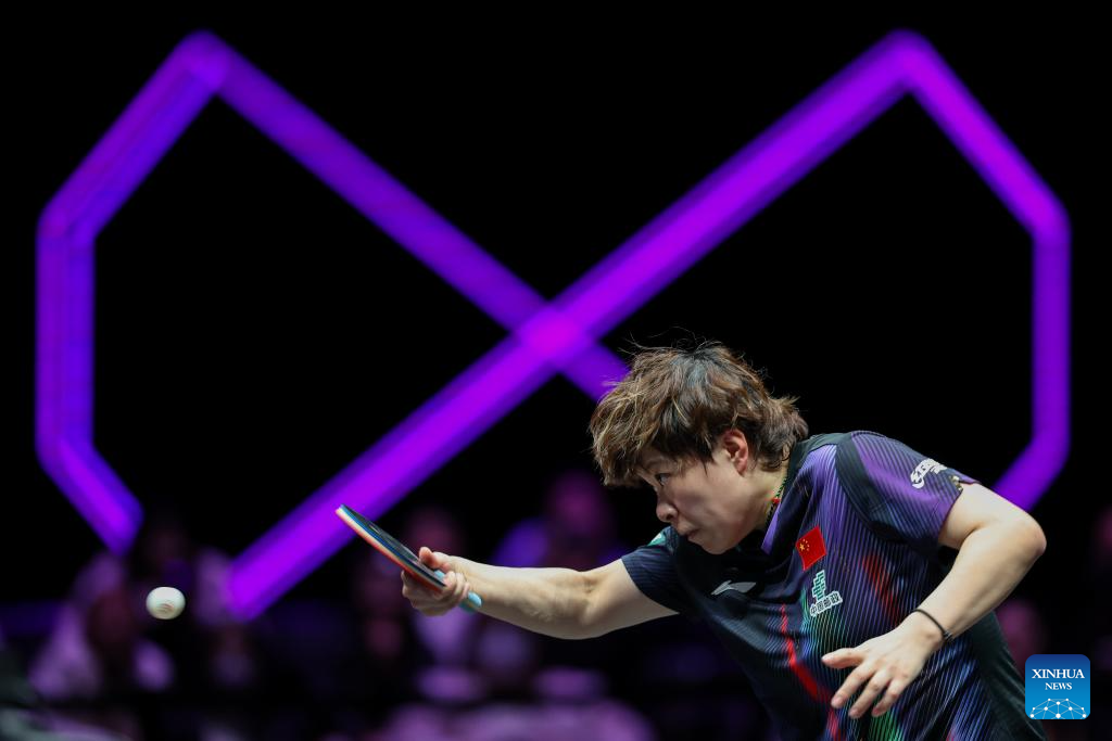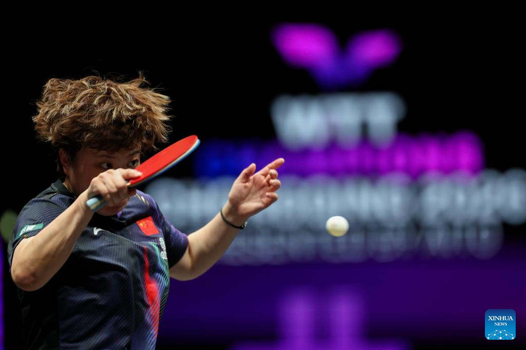 Kuai Man hits a return during the women's singles semifinal between Wang Yidi of China and Kuai Man of China at the WTT Champions Chongqing 2026 in southwest China's Chongqing, March 15, 2026. (Xinhua/Huang Wei)