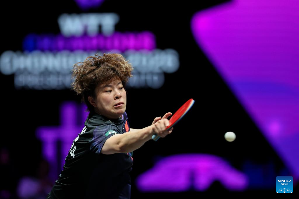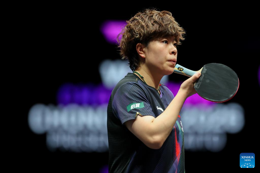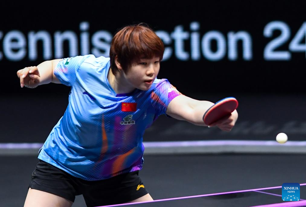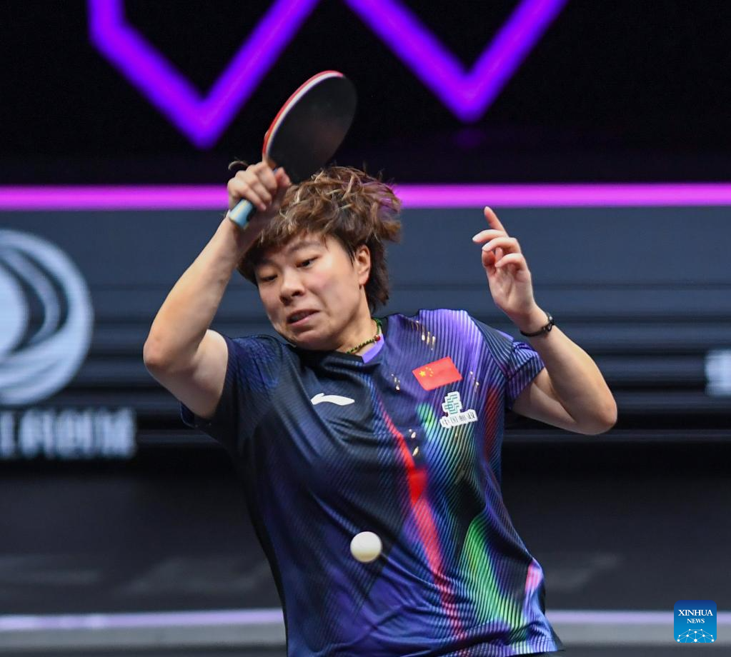 Kuai Man hits a return during the women's singles semifinal between Wang Yidi of China and Kuai Man of China at the WTT Champions Chongqing 2026 in southwest China's Chongqing, March 15, 2026. (Xinhua/Huang Wei)