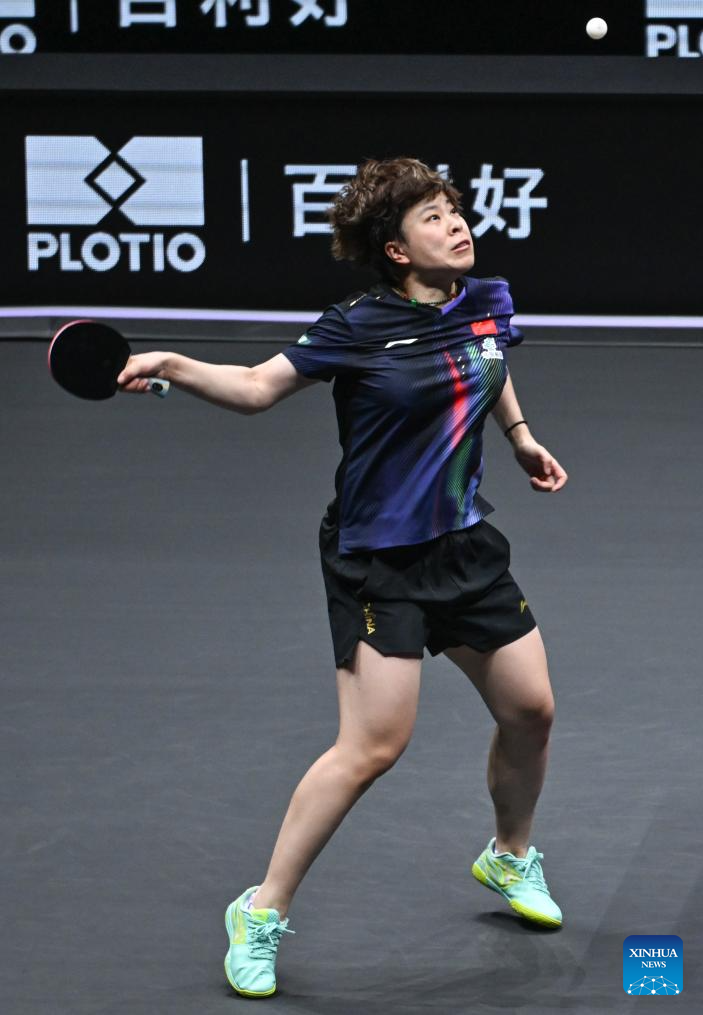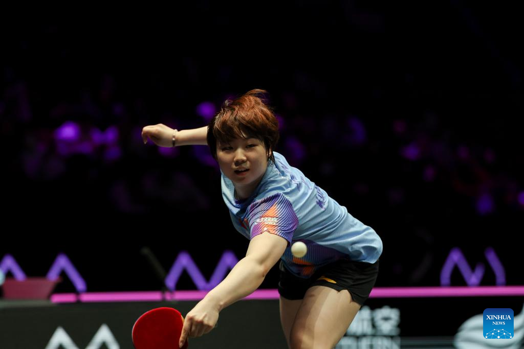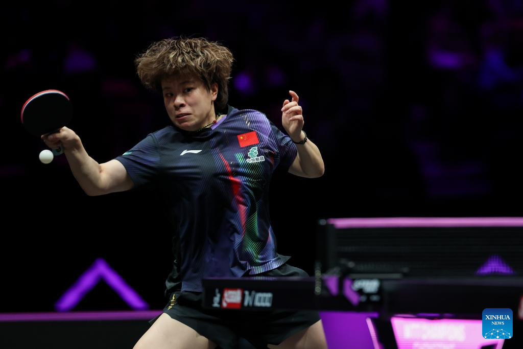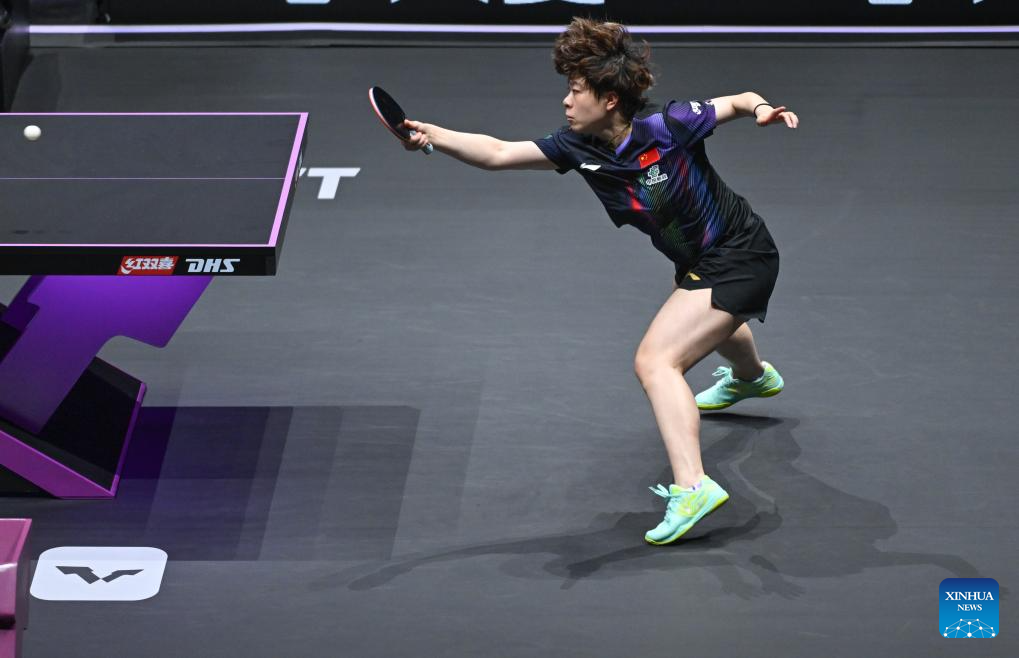 Kuai Man hits a return during the women's singles semifinal between Wang Yidi of China and Kuai Man of China at the WTT Champions Chongqing 2026 in southwest China's Chongqing, March 15, 2026. (Xinhua/Tang Yi)