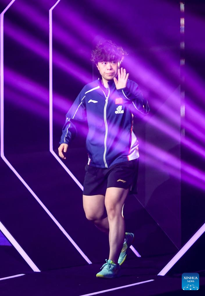 Wang Yidi walks into the court before the women's singles semifinal between Wang Yidi of China and Kuai Man of China at the WTT Champions Chongqing 2026 in southwest China's Chongqing, March 15, 2026. (Xinhua/Tang Yi)