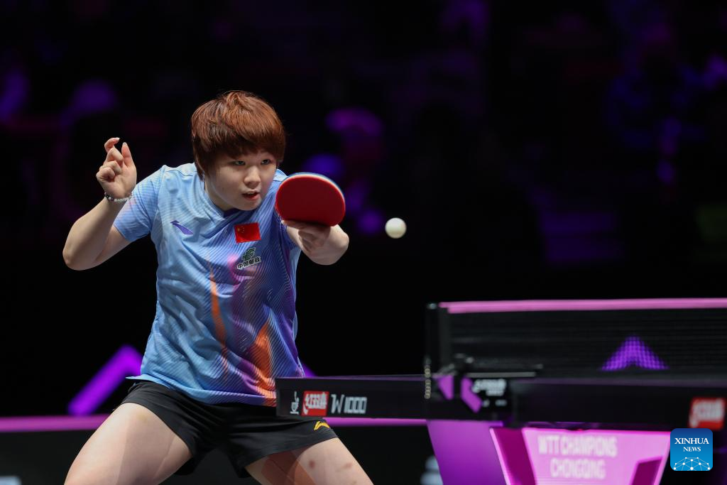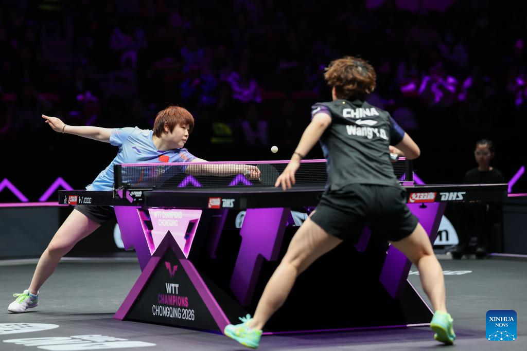 Wang Yidi hits a return during the women's singles semifinal between Wang Yidi of China and Kuai Man of China at the WTT Champions Chongqing 2026 in southwest China's Chongqing, March 15, 2026. (Xinhua/Chen Cheng)