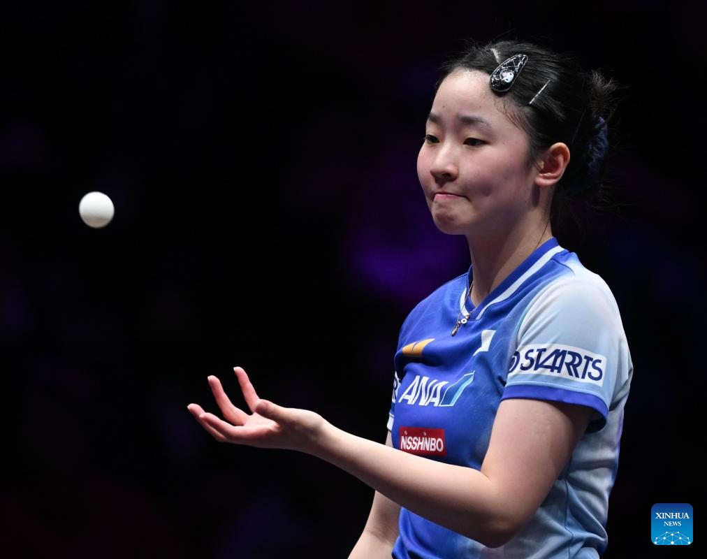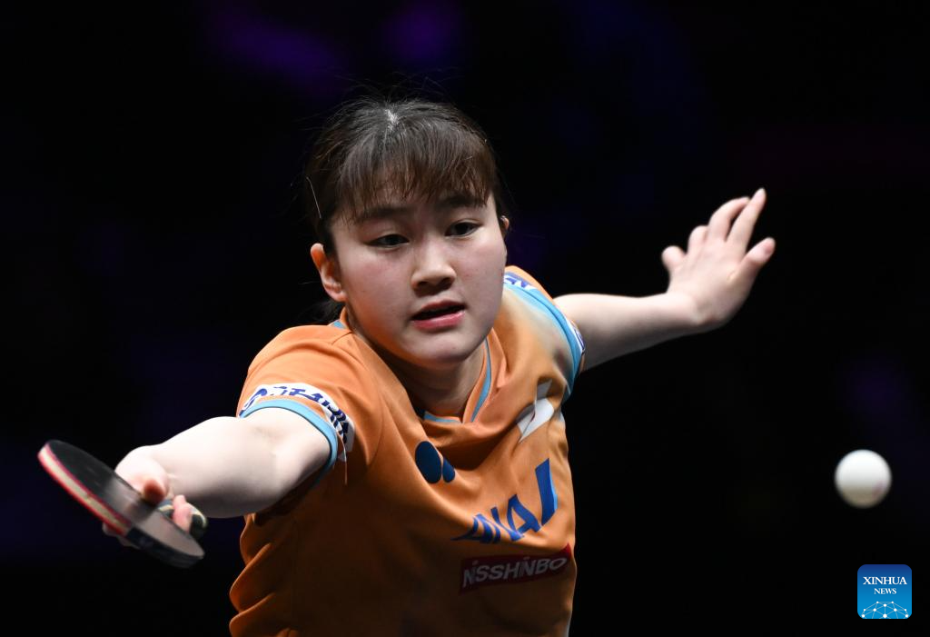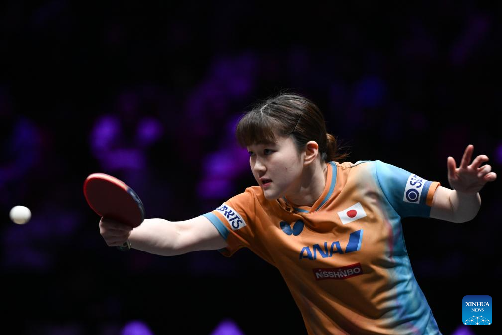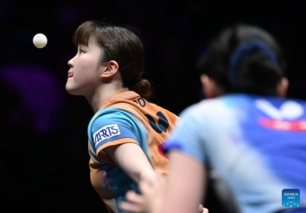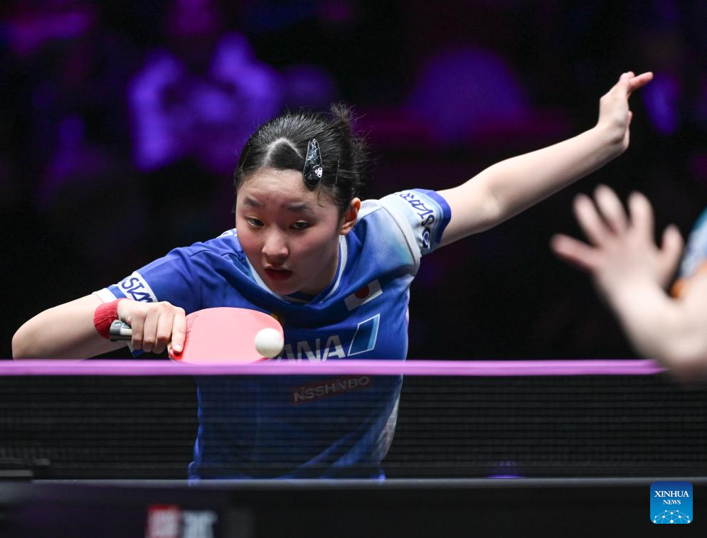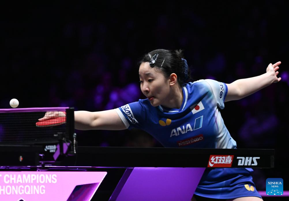 Odo Satsuki hits a return during the women's singles semifinal between Harimoto Miwa of Japan and Odo Satsuki of Japan at the WTT Champions Chongqing 2026 in southwest China's Chongqing, March 15, 2026. (Xinhua/Chen Cheng)