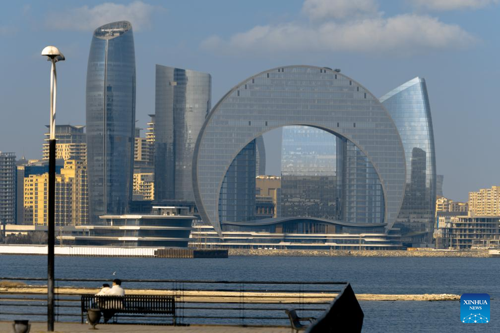 A couple sit on a bench as they enjoy the view across the Caspian Sea towards the skyline in Baku, Azerbaijan, on March 14, 2026. (Xinhua/Chen Junfeng)