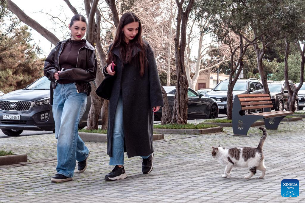 Two pedestrians walk past a cat at a seaside park in Baku, Azerbaijan, on March 14, 2026. (Xinhua/Chen Junfeng)