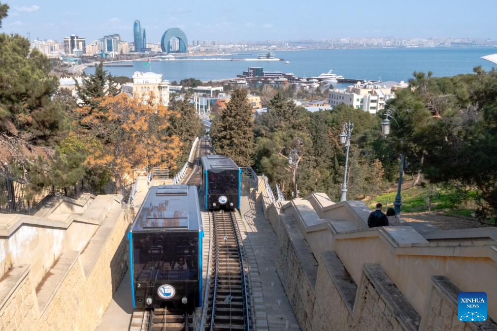 This photo taken on March 14, 2026 shows cable cars in Baku, Azerbaijan. (Xinhua/Chen Junfeng)