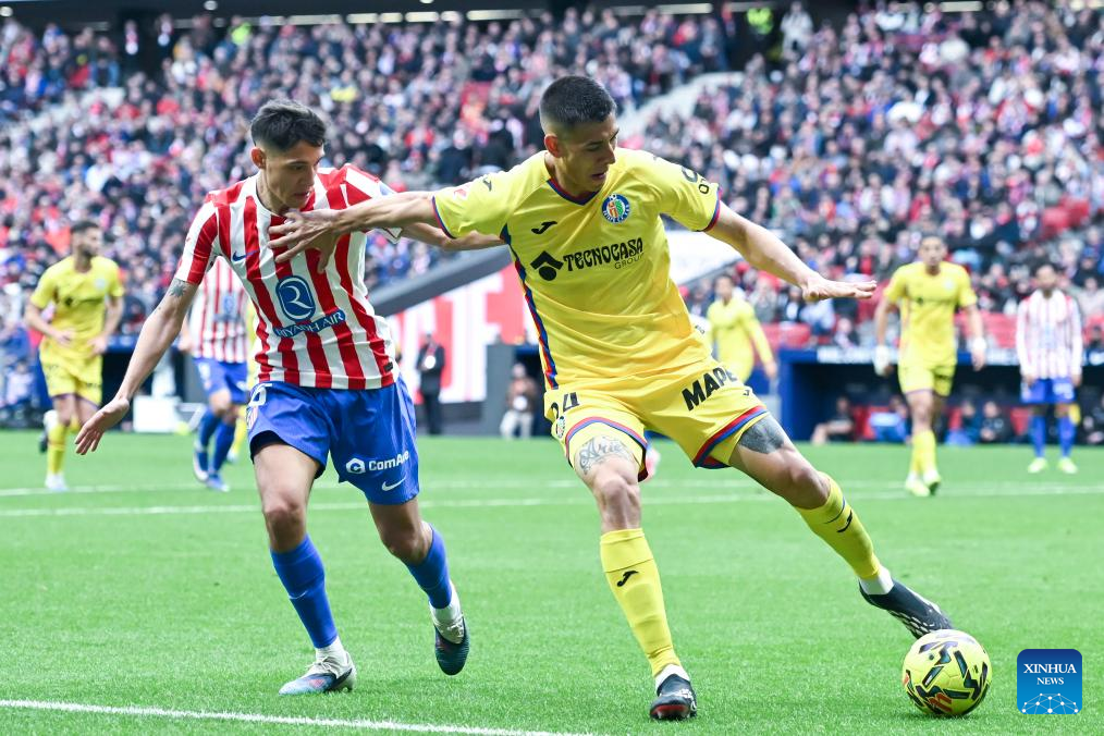Atletico de Madrid's Nahuel Molina (L) vies with Getafe's Zaid Romero during La Liga football match between Atletico de Madrid and Getafe CF in Madrid, Spain, March 14, 2026. (Photo by Gustavo Valiente/Xinhua)