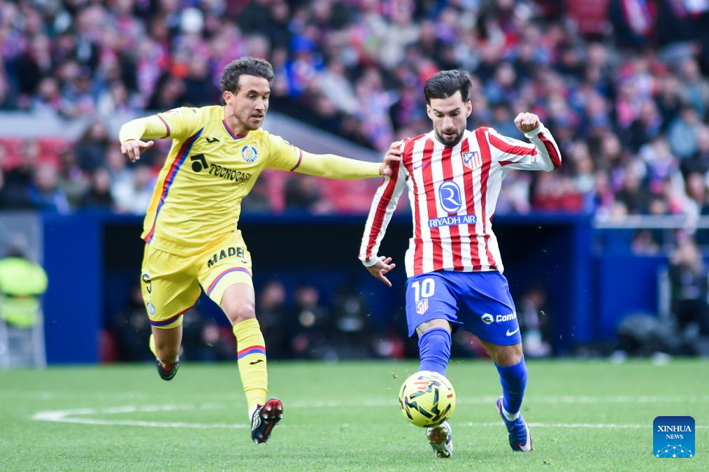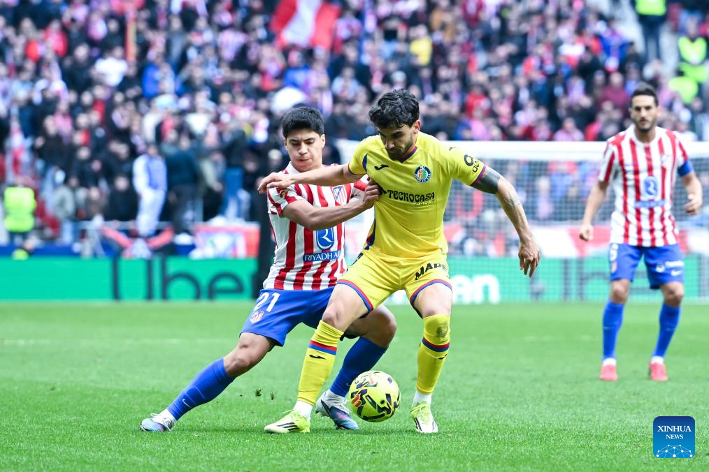Atletico de Madrid's Alex Baena (R) vies with Getafe's Luis Milla during La Liga football match between Atletico de Madrid and Getafe CF in Madrid, Spain, March 14, 2026. (Photo by Gustavo Valiente/Xinhua)