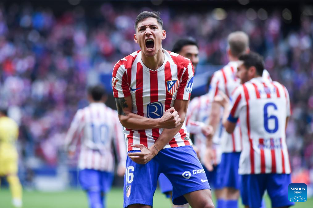 Atletico de Madrid's Nahuel Molina celebrates a goal during La Liga football match between Atletico de Madrid and Getafe CF in Madrid, Spain, March 14, 2026. (Photo by Gustavo Valiente/Xinhua)