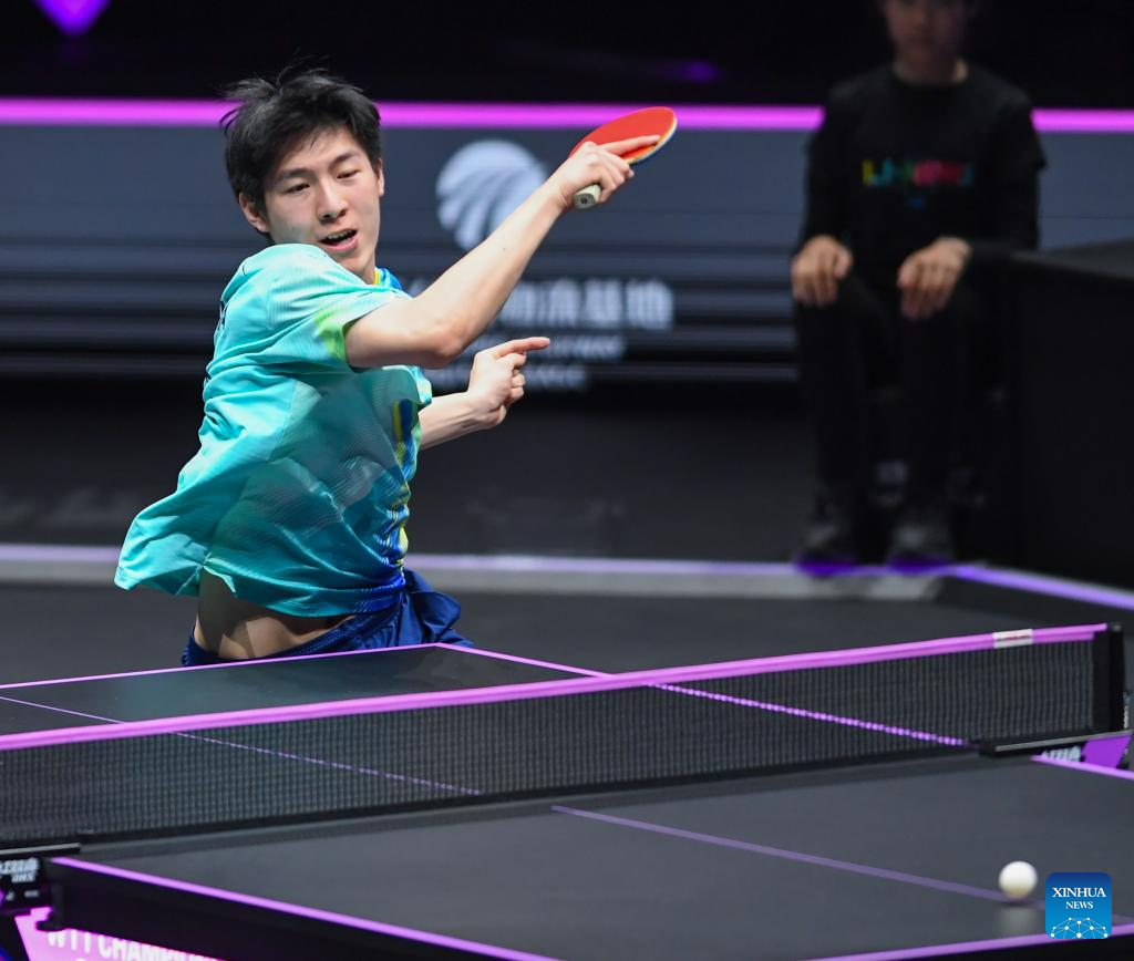 Wen Ruibo hits a return during the men's singles final between Felix Lebrun of France and Wen Ruibo of China at the WTT Champions Chongqing 2026 in southwest China's Chongqing, March 15, 2026. (Xinhua/Huang Wei)