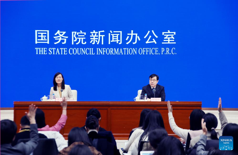 Fu Linghui (R), spokesperson of the National Bureau of Statistics, attends a press conference held by the State Council Information Office (SCIO) on China's economic performance in the first two months of 2026, in Beijing, capital of China, March 16, 2026. (Xinhua/Pan Xu)