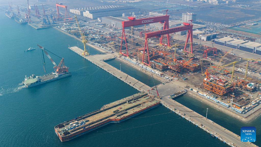 A drone photo taken on March 16, 2026 shows the construction site of an offshore oil and gas platform project in Binhai New Area, north China's Tianjin. (Photo by Du Penghui/Xinhua)