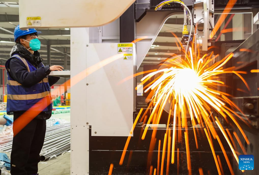 A worker welds at a steel company in an economic development zone in Hengshan County of Hengyang, central China's Hunan Province, on March 16, 2026. China's value-added industrial output, an important economic indicator, went up 6.3 percent year on year in the first two months of 2026, data from the National Bureau of Statistics (NBS) showed on Monday.