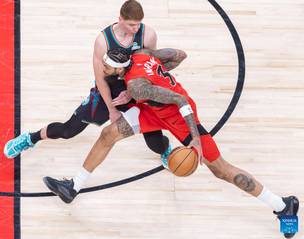 Brandon Ingram (R) of Toronto Raptors breaks through during the 2025-2026 NBA regular season game between Toronto Raptors and Detroit Pistons in Toronto, Canada, on March 15, 2026. (Photo by Zou Zheng/Xinhua)