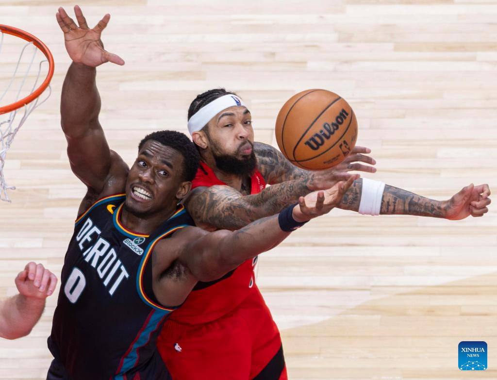 Brandon Ingram (R) of Toronto Raptors fights for a rebound with Jalen Duren of Detroit Pistons during the 2025-2026 NBA regular season game between Toronto Raptors and Detroit Pistons in Toronto, Canada, on March 15, 2026. (Photo by Zou Zheng/Xinhua)