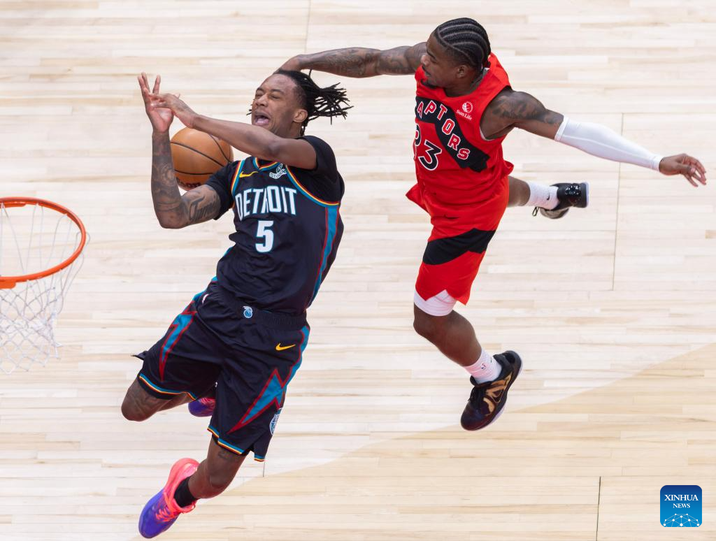 Jamal Shead (R) of Toronto Raptors vies with Ronald Holland II of Detroit Pistons during the 2025-2026 NBA regular season game between Toronto Raptors and Detroit Pistons in Toronto, Canada, on March 15, 2026. (Photo by Zou Zheng/Xinhua)