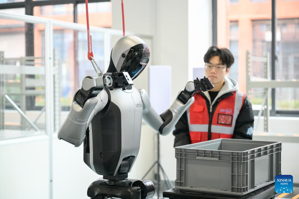 A staff member trains a humanoid robot to carry objects at the Sichuan Humanoid Robot Multimodal Data Collection and Testing Center in Zigong City, southwest China's Sichuan Province, Jan. 8, 2026. (Xinhua)