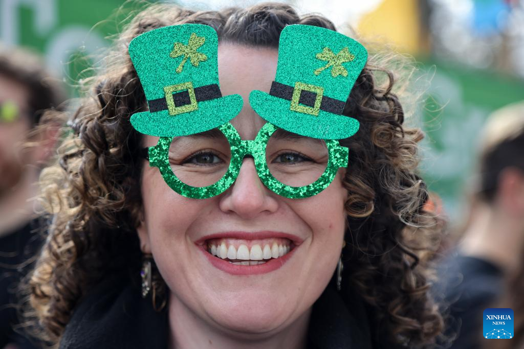A woman attends the St. Patrick's Day Parade in London, Britain, March 15, 2026. St. Patrick's Day, which falls annually on March 17, is widely celebrated by Irish communities around the world. (Xinhua)
