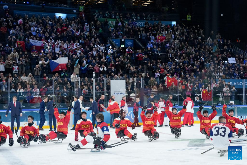Players of China celebrate after winning the Para Ice Hockey bronze medal match between China and the Czech Republic at the Milan-Cortina 2026 Paralympic Winter Games in Milan, Italy, March 15, 2026. (Xinhua/Li Jing)