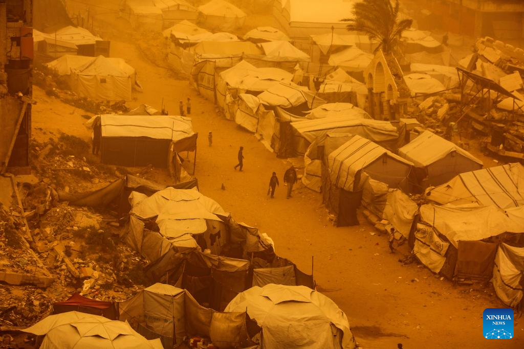 Palestinians walk through a sandstorm in a camp housing displaced Palestinians in the west of Gaza City, on March 14, 2026. (Photo by Rizek Abdeljawad/Xinhua)