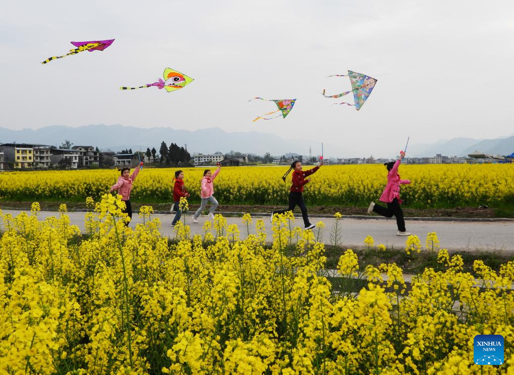 Students fly kites amid rapeseed flowers in Xinhe Village of Pu'an Township in Dazhou, southwest China's Sichuan Province, March 14, 2026. (Photo by Deng Liangkui/Xinhua)