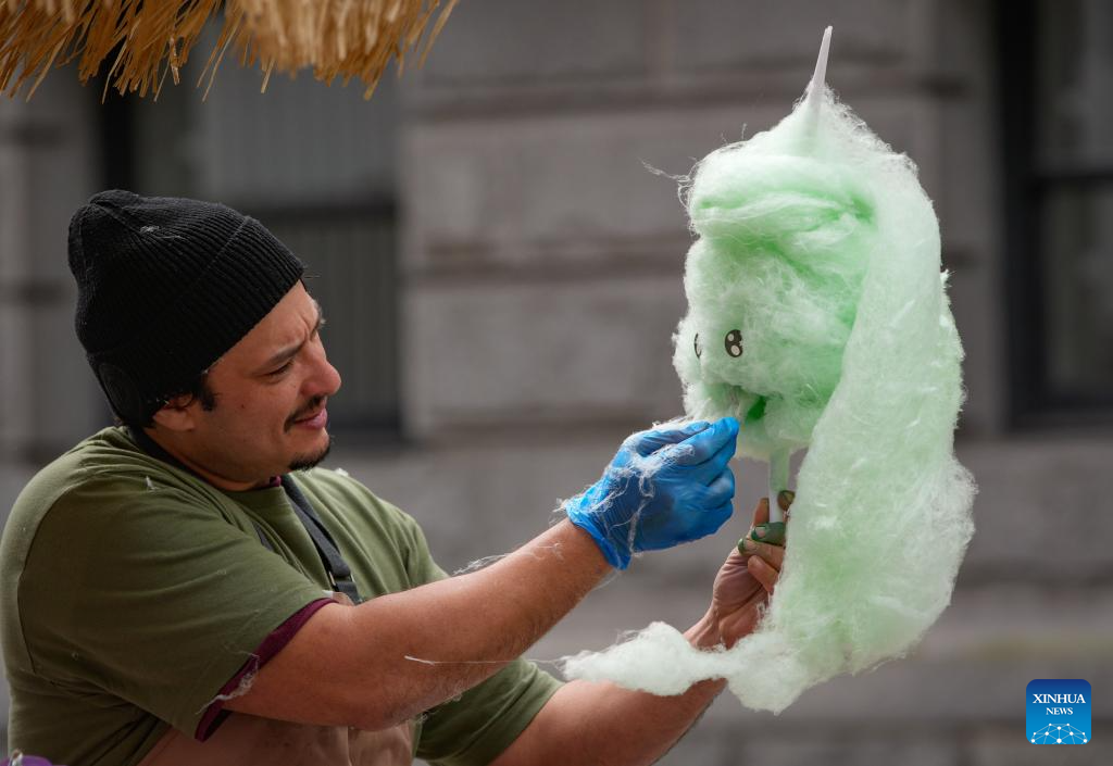 A vendor shapes a cotton candy during the Family Day event of CelticFest in Vancouver, British Columbia, Canada, March 15, 2026. The annual CelticFest brings the local community in celebration of Celtic culture, featuring live Celtic music, Irish dance performances and family-friendly activities. (Photo by Liang Sen/Xinhua)