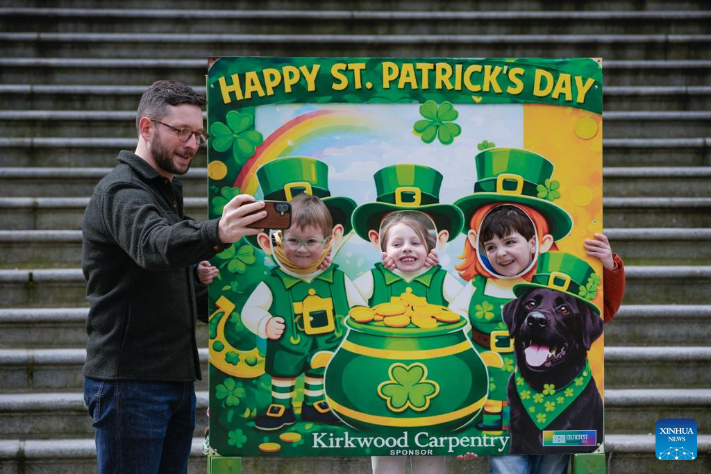A man takes a photo of three children as they pose behind a St. Patrick's Day cutout during the Family Day event of CelticFest in Vancouver, British Columbia, Canada, March 15, 2026. The annual CelticFest brings the local community in celebration of Celtic culture, featuring live Celtic music, Irish dance performances and family-friendly activities. (Photo by Liang Sen/Xinhua)