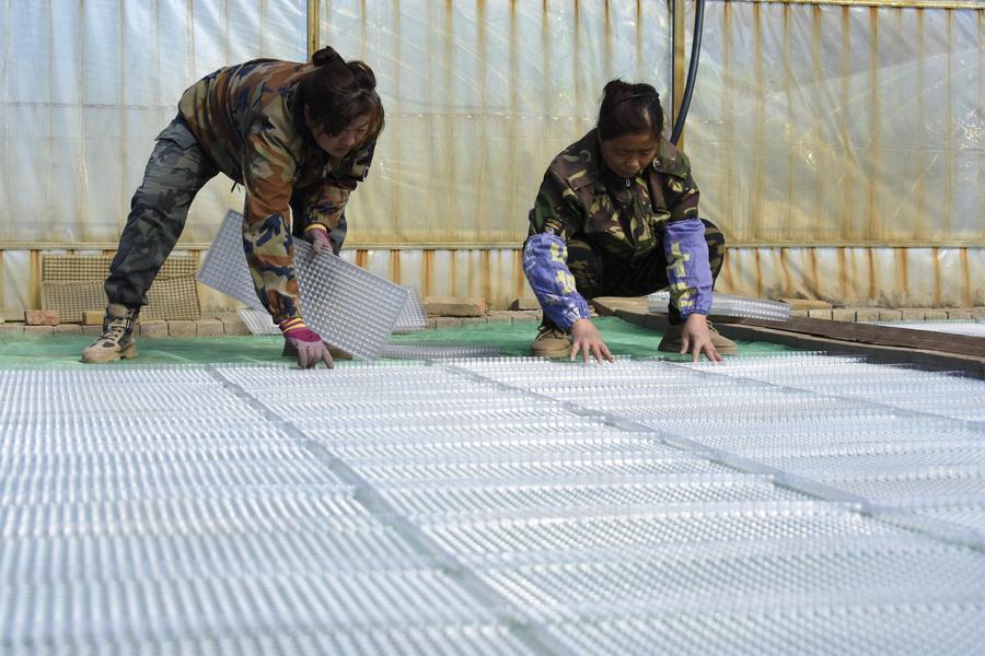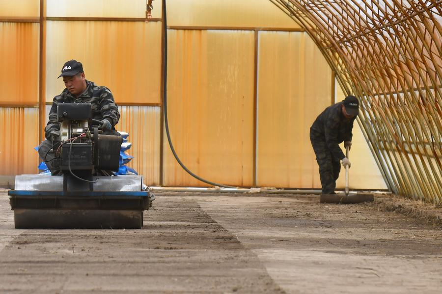 A drone photo taken on March 17, 2026 shows farmers preparing for seedling cultivation at Youyi Farm Co., Ltd. under Beidahuang Group in northeast China's Heilongjiang Province. (Photo by Xu Hongyu/Xinhua)