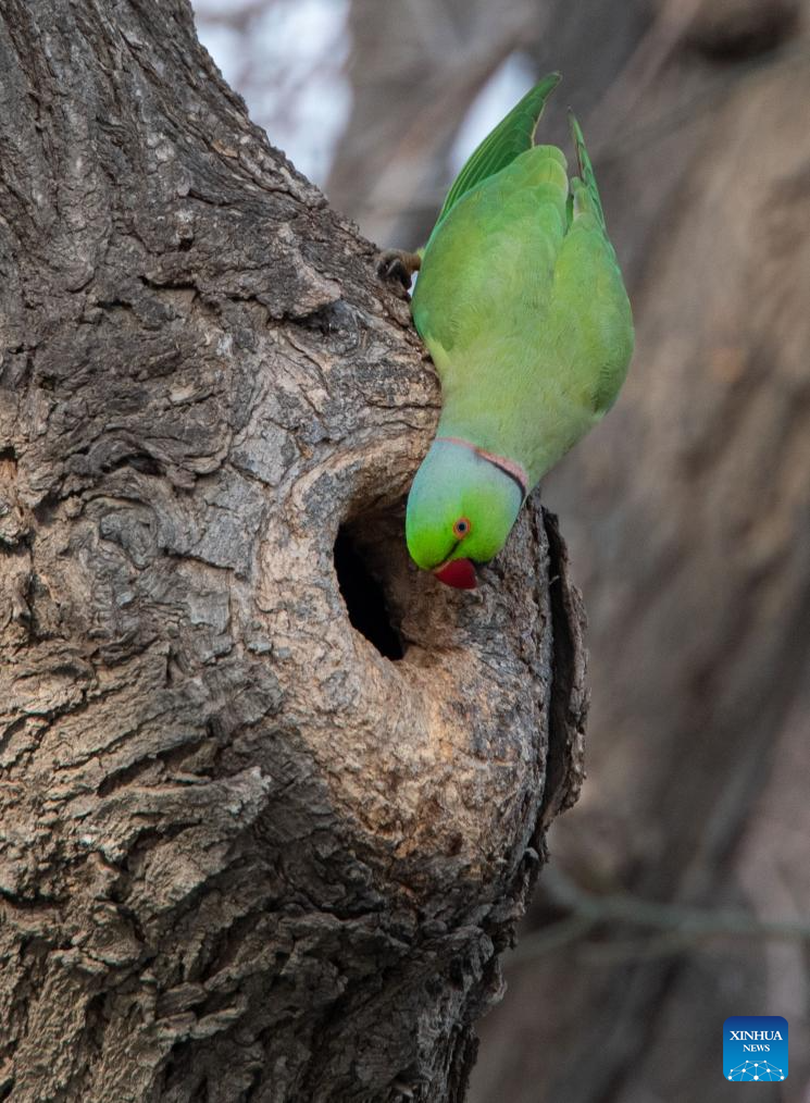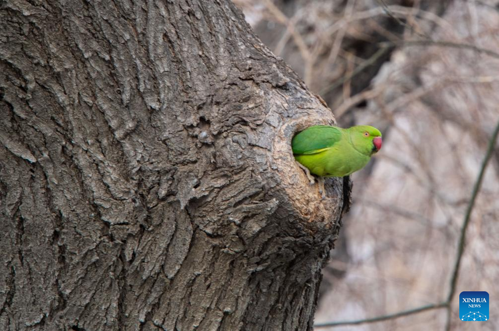 A rose-ringed parakeet is seen in a tree hole on the Seaside Boulevard in Baku, Azerbaijan, March 16, 2026. (Xinhua/Chen Junfeng)