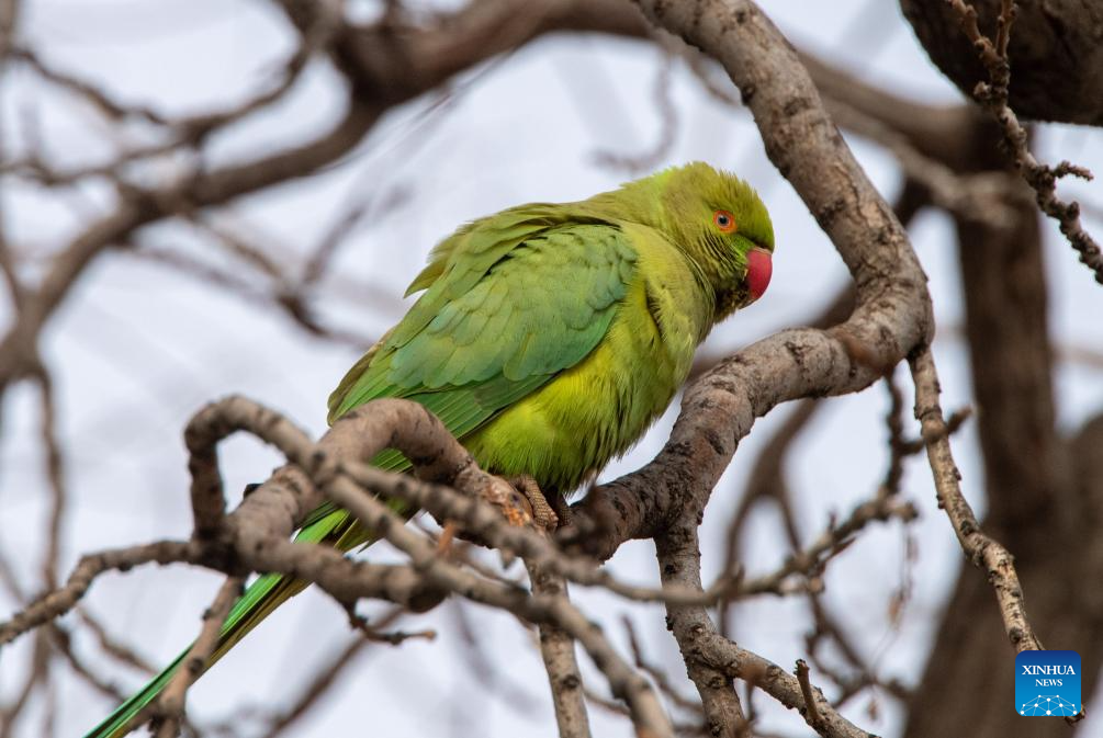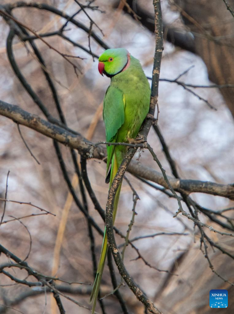A rose-ringed parakeet perches on a tree branch on the Seaside Boulevard in Baku, Azerbaijan, March 16, 2026. (Xinhua/Chen Junfeng)