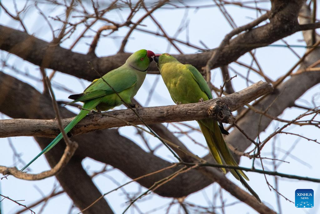 Rose-ringed parakeets perch on a tree branch on the Seaside Boulevard in Baku, Azerbaijan, March 16, 2026. (Xinhua/Chen Junfeng)