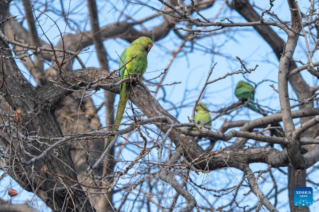 Rose-ringed parakeets are seen on a tree on the Seaside Boulevard in Baku, Azerbaijan, March 16, 2026. (Xinhua/Chen Junfeng)