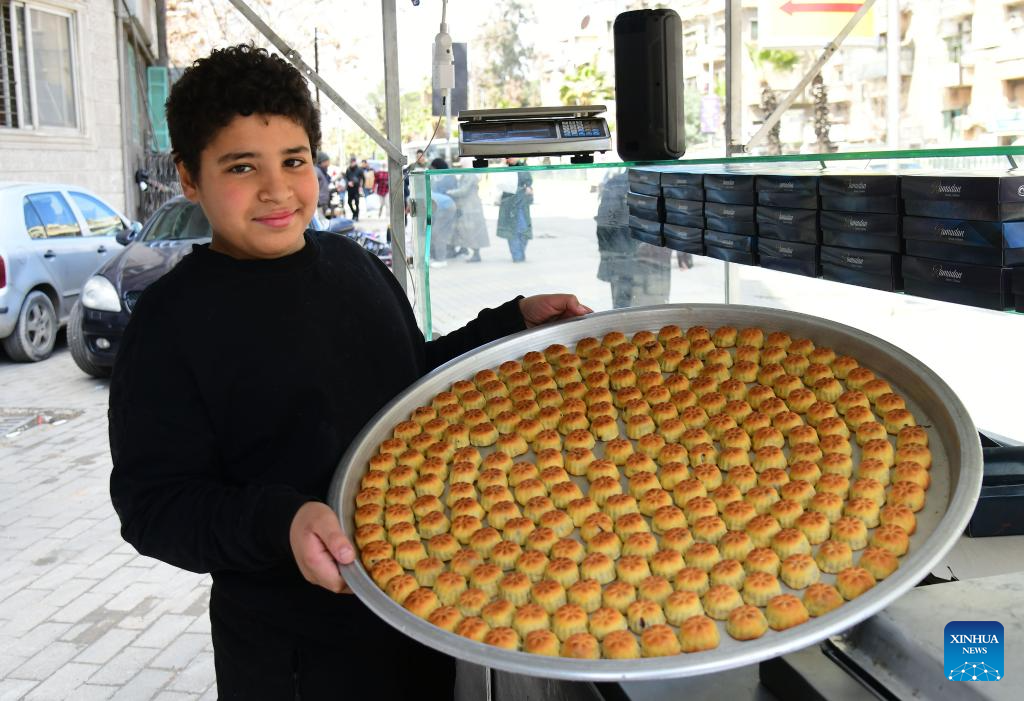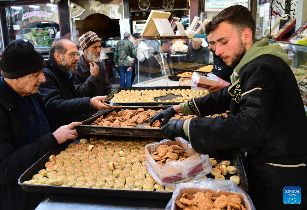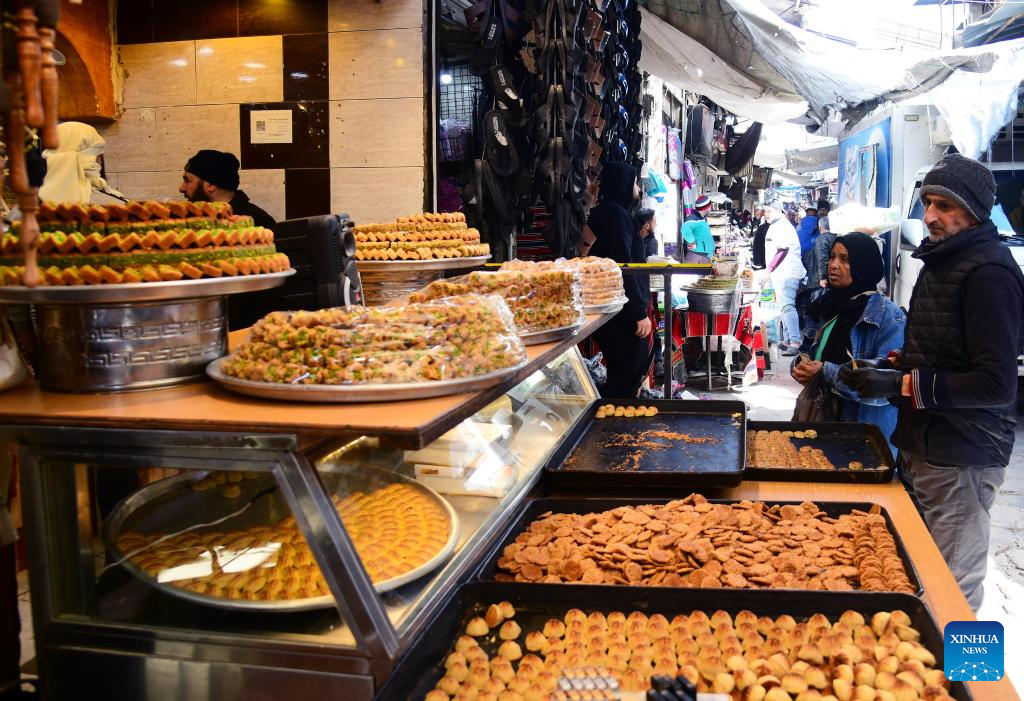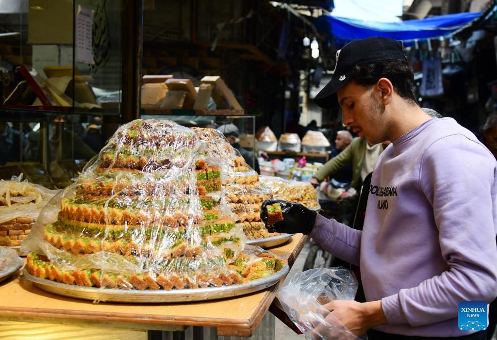 Vendors sell traditional sweets ahead of the upcoming Eid al-Fitr at a market in Damascus, Syria, March 16, 2026. (Photo by Ammar Safarjalani/Xinhua)
