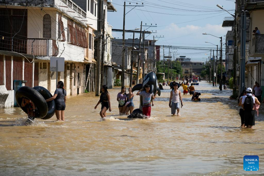 People carry belongings in the flood in Babahoyo, Los Rios, Ecuador, March 15, 2026. According to local authorities, at least 11 people were dead in Ecuador due to the rain-triggered flood and landslides this year. (Photo by Ricardo Landeta/Xinhua)